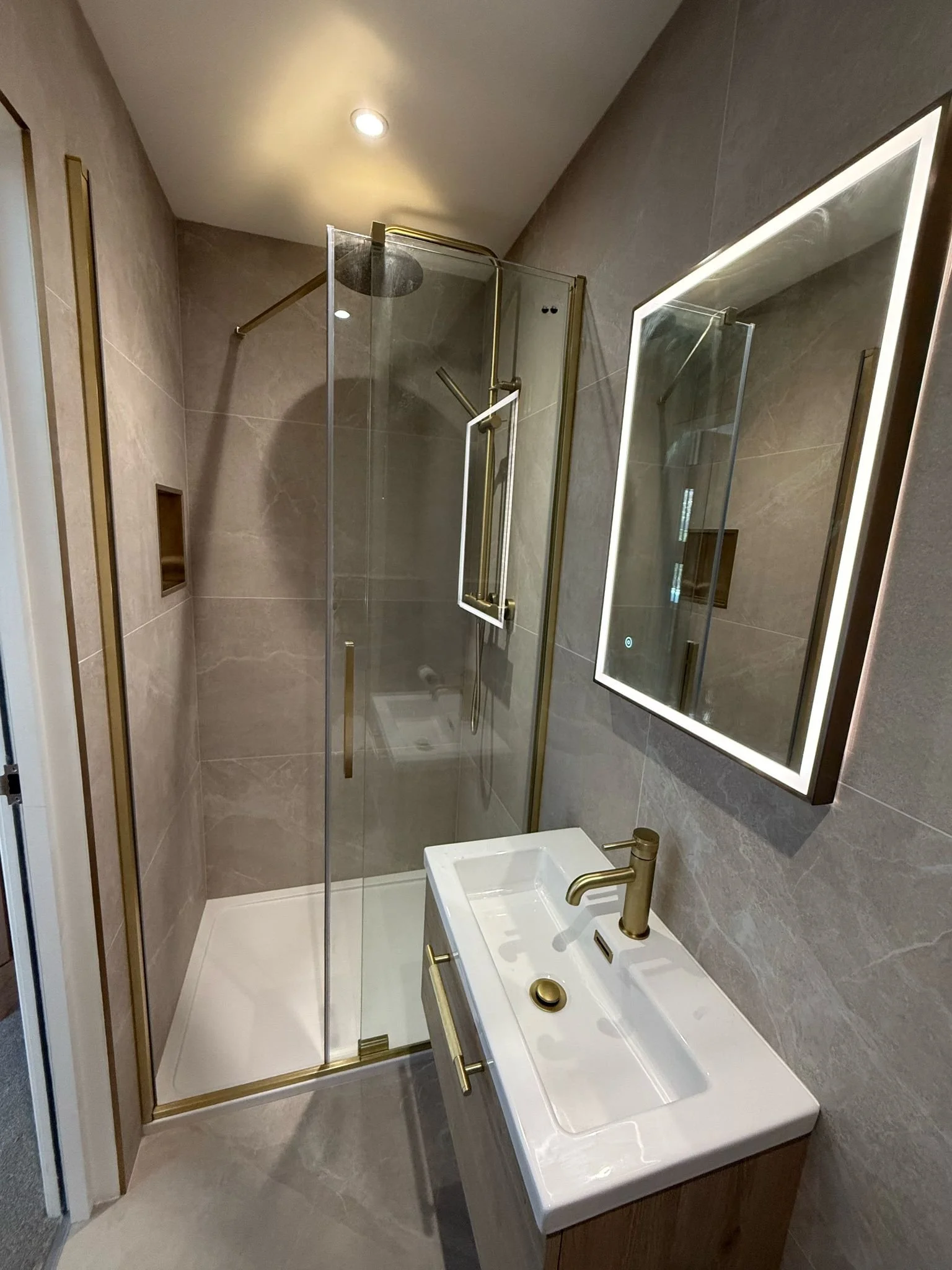 A beautifully finished, fully tiled bathroom featuring elegant porcelain tiles. It includes a sleek Geberit wall-hung toilet and matching vanity unit, complemented by Aqualla Kyloe brassware throughout. The space is completed with a Tissino anti-slip shower tray and an Aqualla Aromawell radiator, combining modern style with practical luxury.