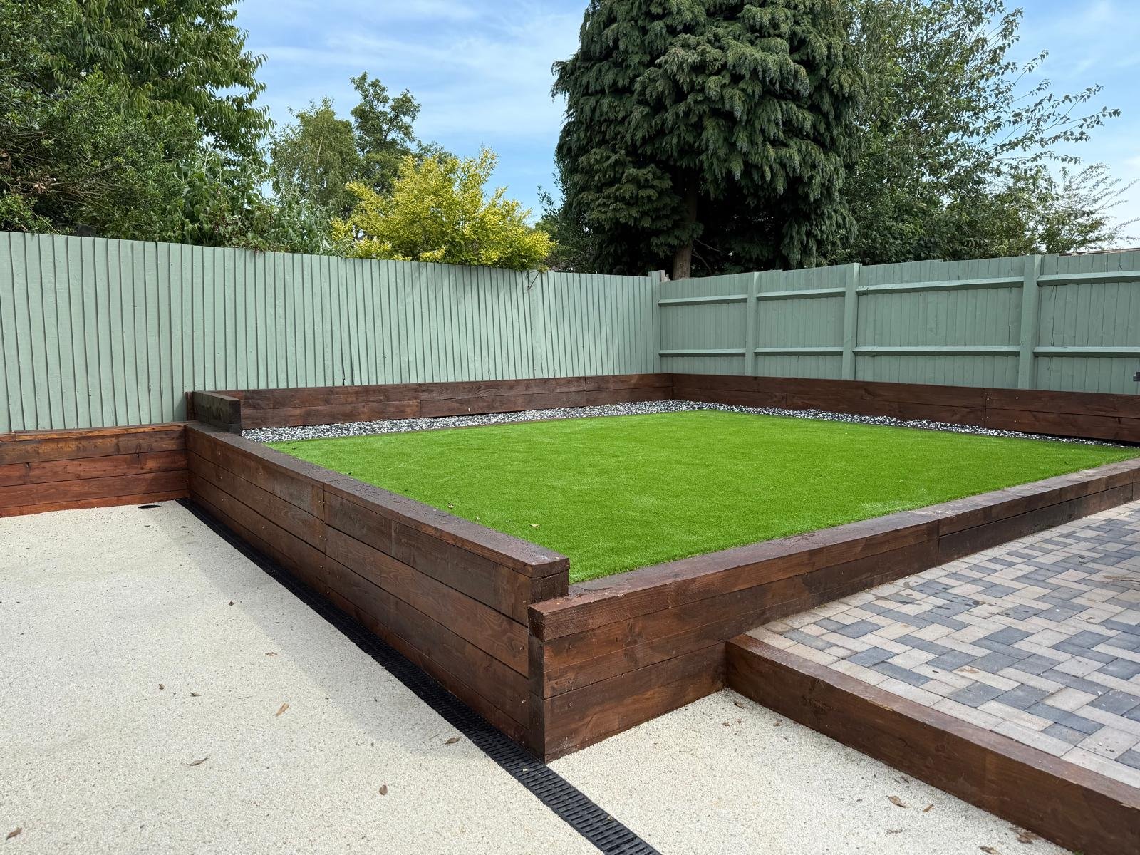 A spacious rear garden featuring a resin path with seating on the lower level, complemented by artificial grass for year-round use.